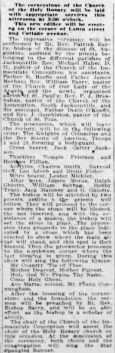 The impressive ceremony will be performed by Rt. Rev. Patrick Barry, bishop of the diocese of St. Augustine, assisted by the priests belonging to the different parishes of Jacksonville. Rev. Michael Maher, DD, pastor of the Church of the Immaculate Conception, his assistance, Father R. Roche and Father James Meehan,; Rev. William Barry, pastor of the Church of Our Lady of the Angels, and the newly organized parish of St. Paul's; Rev. P.J. Bres-nahan, pastor of the Church of the Assumption, South Jacksonville, and his assistant, Father Dennis O'Keefe, and Rev. J. Gumbleton, pastor of the Church of St. Pius.